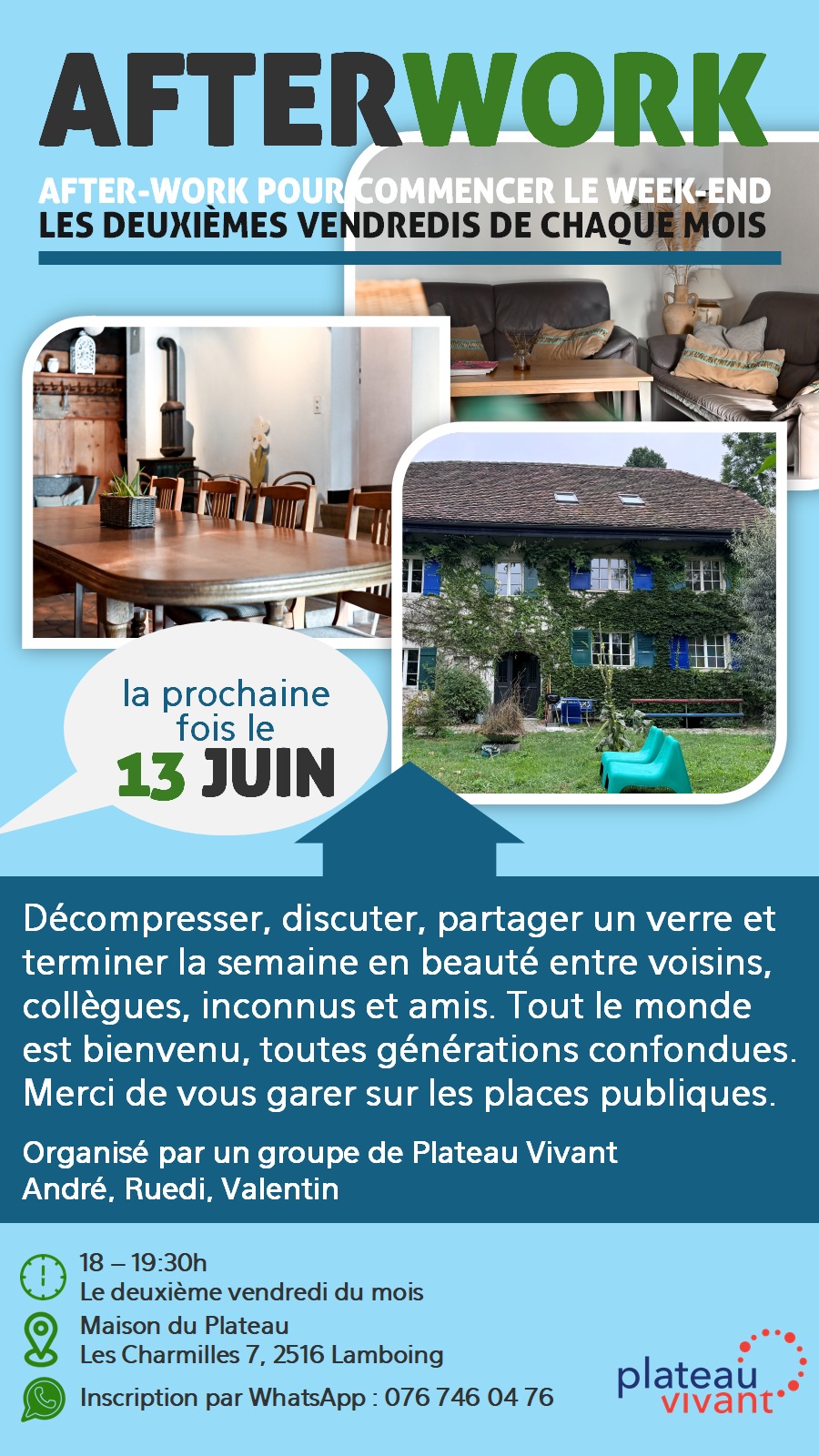 Afterwork pour commencer le week-end, chaque deuxième vendredi du mois à la Maison du Plateau, Les Charmilles 7, 2516 Lamboing. La prochaine rencontre aura lieu le 13 juin, de 18h à 19h30.