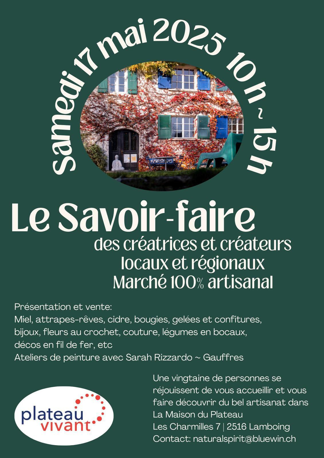 Le samedi 17 mai 2025 de 10h à 15h, venez découvrir le savoir-faire des créatrices et créateurs locaux et régionaux à la Maison du Plateau, Les Charmilles 7, 2516 Lamboing.