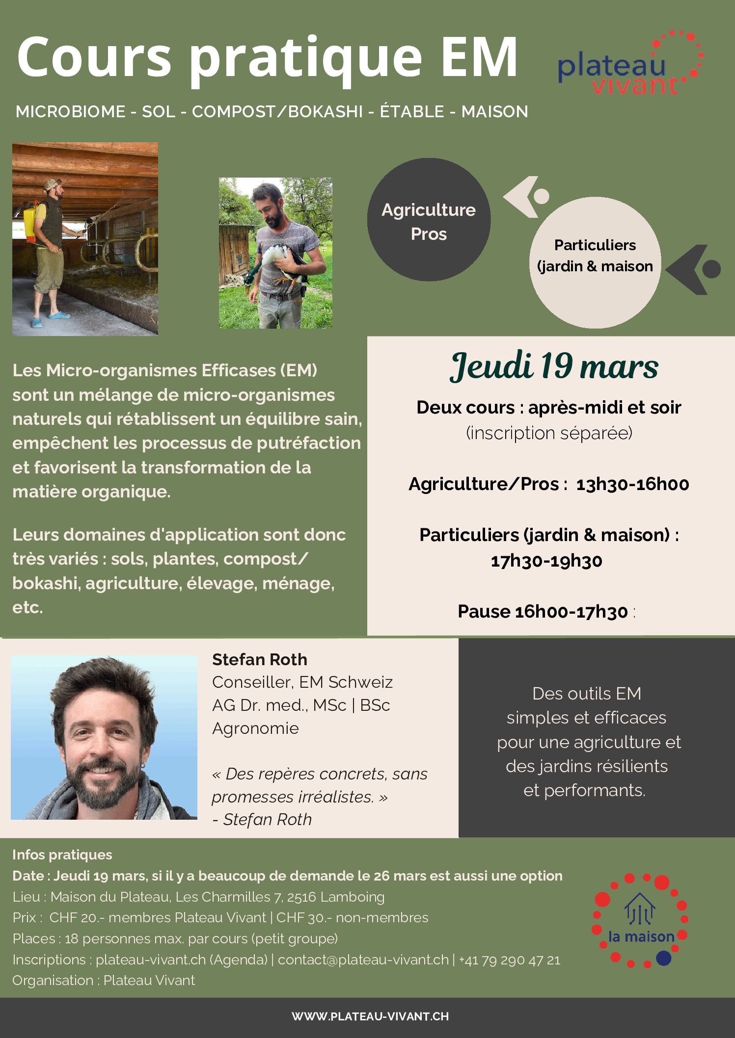Le jeudi 19 mars 2026, Plateau Vivant propose à la Maison du Plateau (Lamboing) une soirée de cours dédiée aux Microorganismes Efficaces (EM), avec un format pensé pour les professionnels comme pour les particuliers.