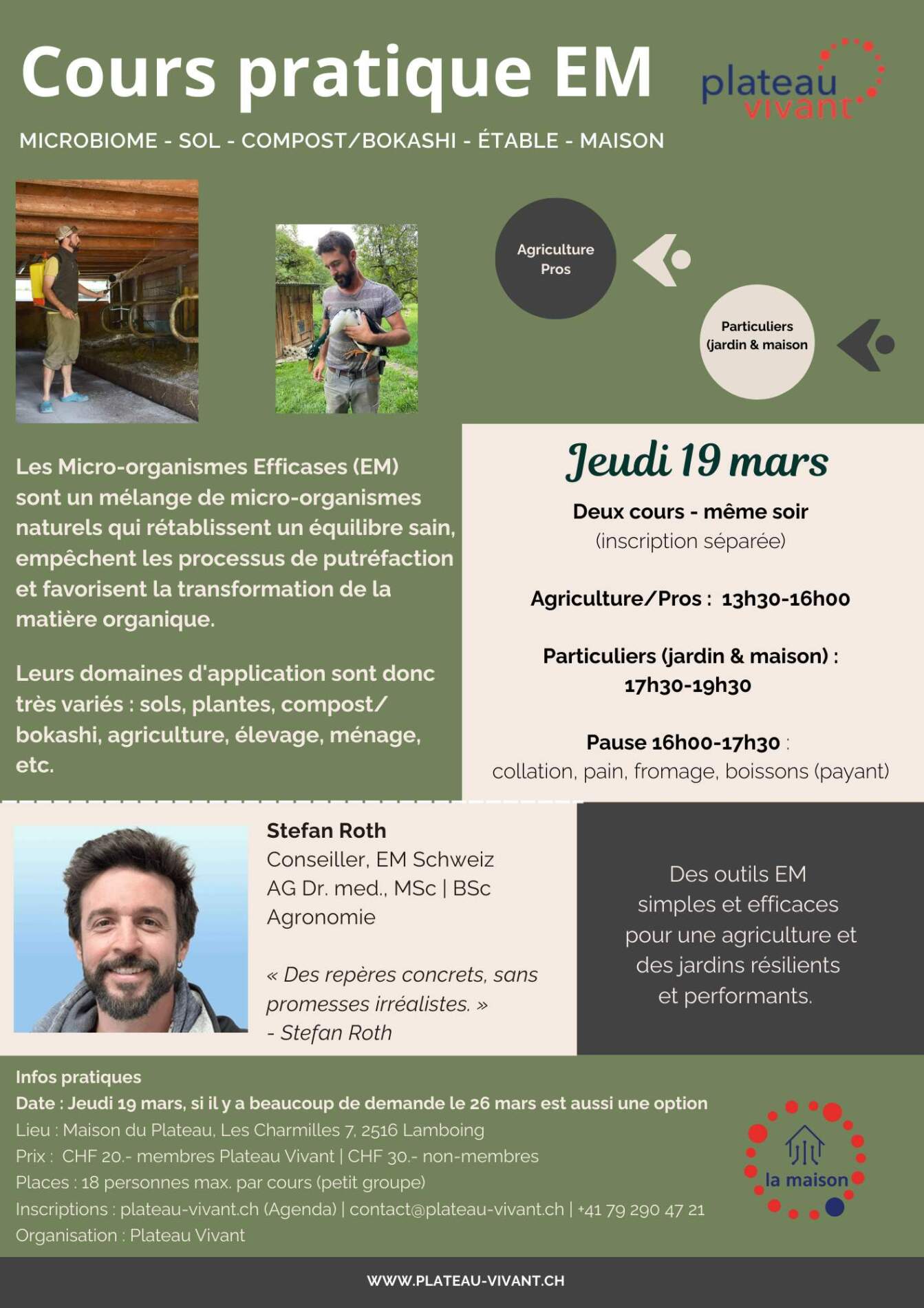 L’intervenant, Stefan Roth, conseiller chez EM Schweiz, apportera une lecture à la fois scientifique et de terrain. Médecin (Dr. med., MSc – médecine humaine) et agronome (BSc Agronomie HES), il insiste sur une approche réaliste : « Les EM ne sont pas une baguette magique. L’intérêt, c’est de comprendre les processus microbiens et d’apprendre à les utiliser correctement — avec des contrôles simples, de bonnes pratiques et des attentes réalistes », souligne-t-il.