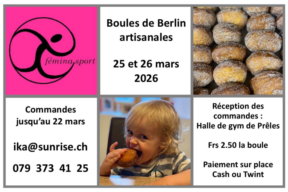 Les 25 et 26 mars 2026, la société de gymnastique FEMINA Sport organise une grande vente de délicieuses boules de Berlin artisanales afin de financer ses activités et ses projets pour l’année à venir.