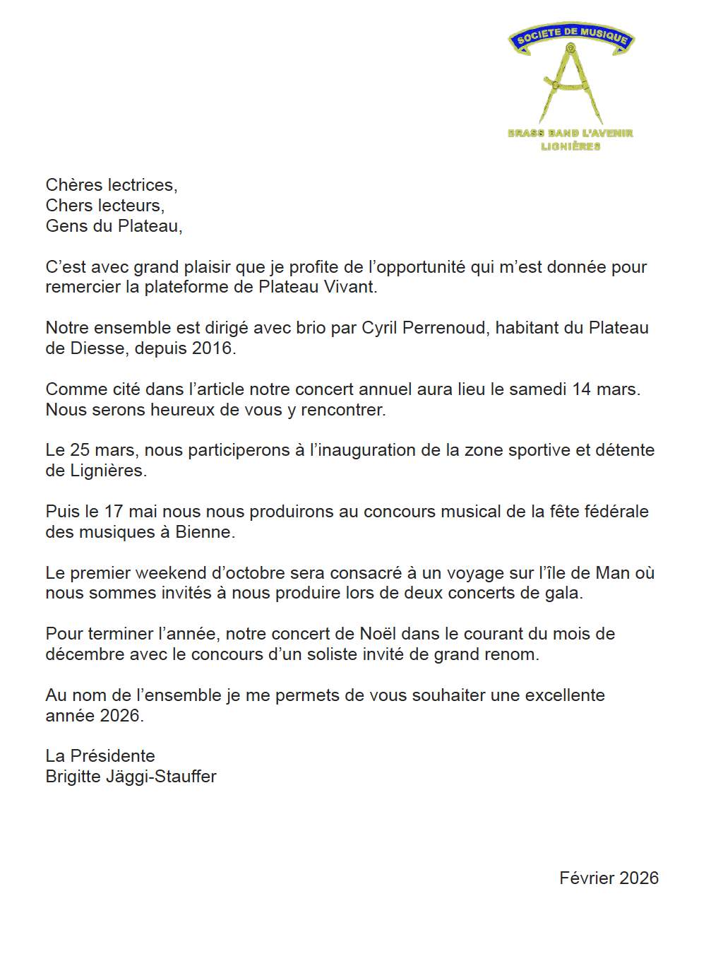 Par son engagement sur la durée, le Brass Band de Lignières contribue activement à la vie culturelle du Plateau. Il rappelle combien les sociétés locales jouent un rôle essentiel dans la cohésion sociale, la transmission et le dynamisme régional. Après 100 ans d’histoire, le Brass Band continue d’écrire la sienne, avec enthousiasme et ouverture vers l’avenir.